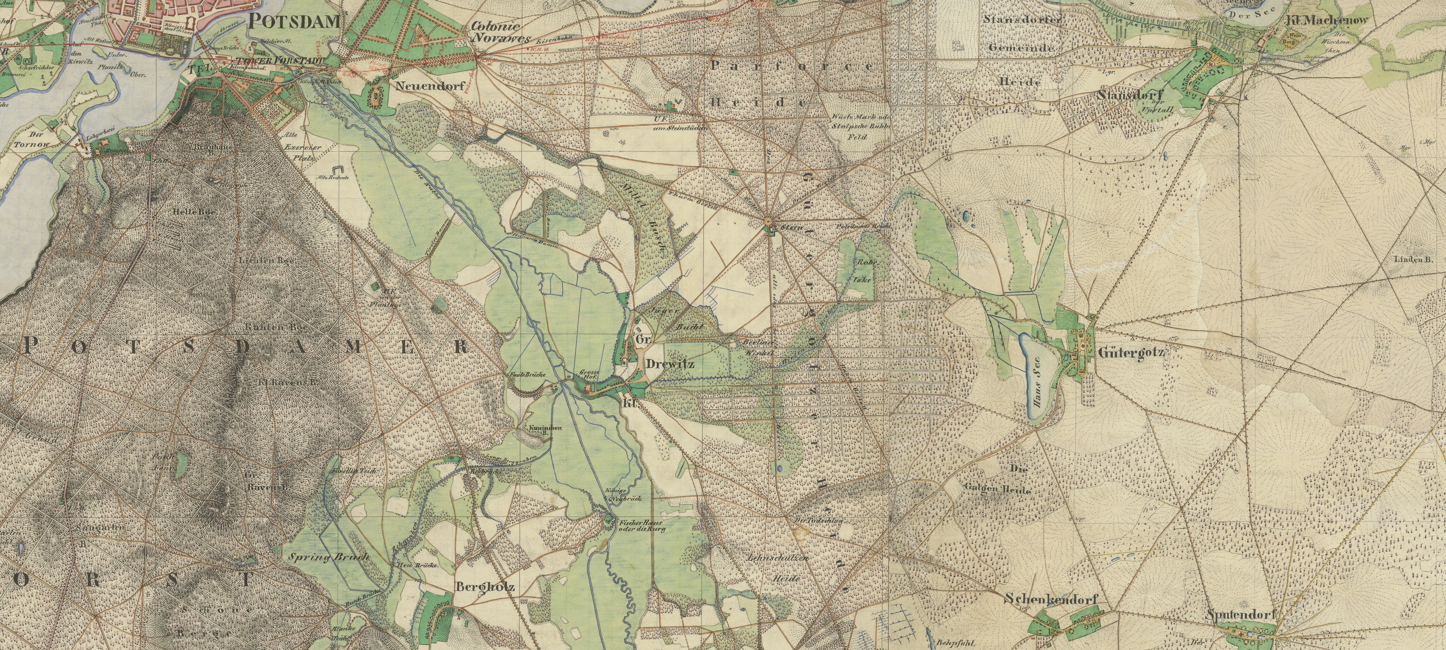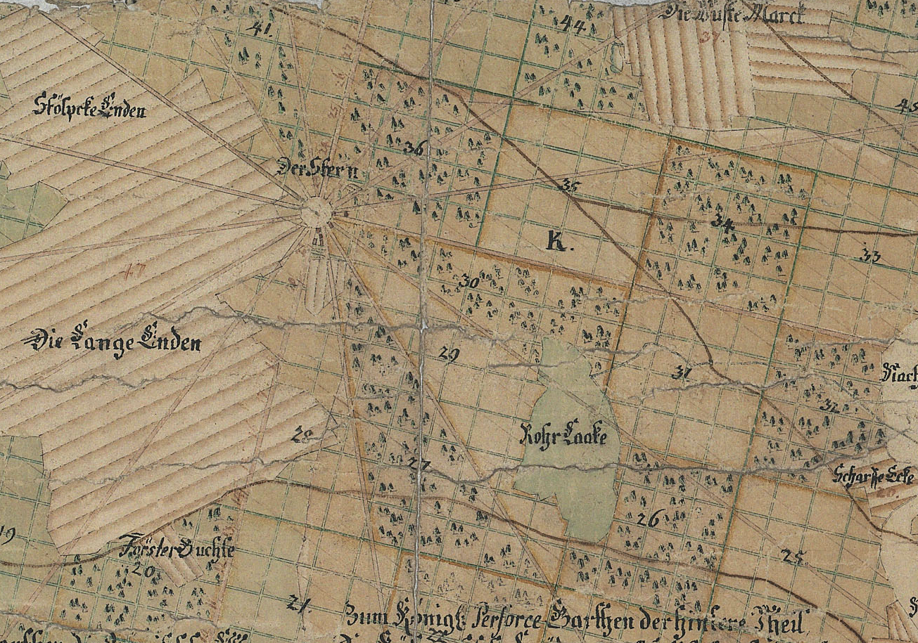 In diesem Schreiben erfolgte die erste Erwähnung des bis heute als Parforceheide bekannten Wald- und Feldgebiets zwischen den Dörfern Neuendorf, Stolpe, Drewitz, Gütergotz (Güterfelde) und Stahnsdorf. Der mit einem Palisadenzaun umhegte „Königliche Parforcegarten“ reichte bis an die Gemarkung Kleinmachnow und südlich bis nach Philippsthal. In den Wald wurden ursprünglich 16 Schneisen (Gestelle) geschlagen, die sternförmig zum Mittelpunkt der Jagdanlage führten. Der Wegestern diente der leichteren Orientierung nach der Jagd und ermöglichte auch ein Absperren von querenden Wildwechseln mit Hilfe von Tüchern oder Jagdlappen, um so das jeweilige Jagdgebiet näher einzugrenzen. Ausgeführt wurde die Aktion vom „Königlichen Conducteur und Landmesser bei der Jägerei“ Conradt Henning mit 258 Mann. Die planierten Gestelle hatten eine Breite von 1 1/2 preußischen Ruten, umgerechnet rund fünfeinhalb Metern. Schon im Jahr darauf war das Werk vollendet. Mit dem 1730-32 an dem Wegestern im holländischen Stil errichteten kleinen Jagdschloss und dem dazu gehörenden Gebäudeensemble wurde hier eine auch heute noch im Landschaftsbild gut erkennbare barocke Jagdanlage geschaffen.